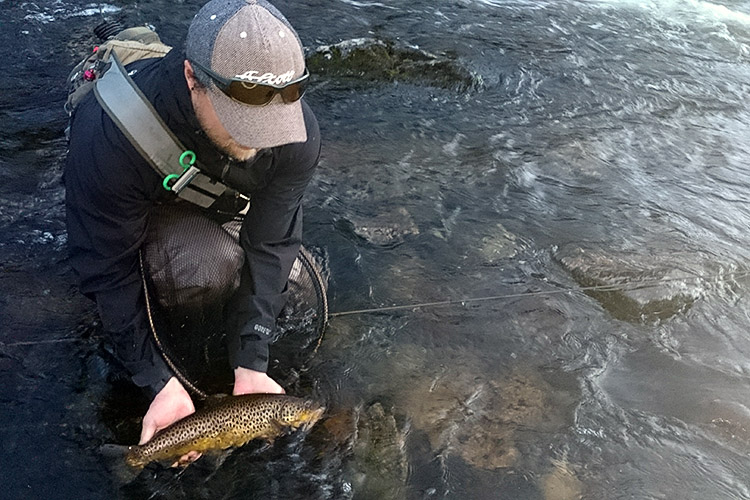 Vastuullinen kalastaja vapauttaa taimenen jo vedessä.